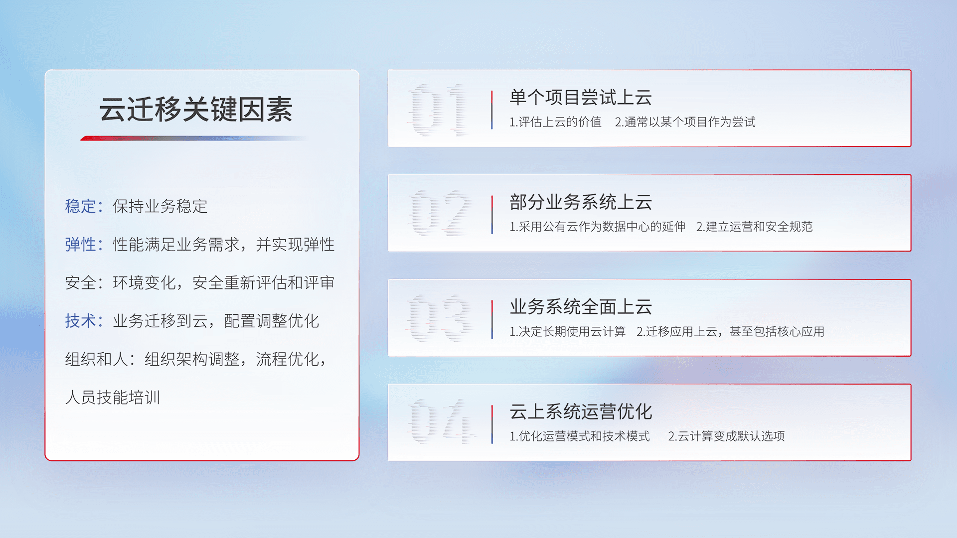 结合实际业务,,,,从规划设计、、、云平台选型、、、、云原生改造、、、数据迁移、、集成交付,,,,迁移全过程为客户识别最佳上云路径,,做好风险识别管理,,,,设计网络架构、、身份权限、、、安全审计合规、、操作审计、、、日志审计、、监控告警策略、、、、多站点容灾设计等,,,对云上基础设施进行整体规划,,,提升IT治理水平,,以满足弹性、、、高可用、、、、高性能的需求。。。。